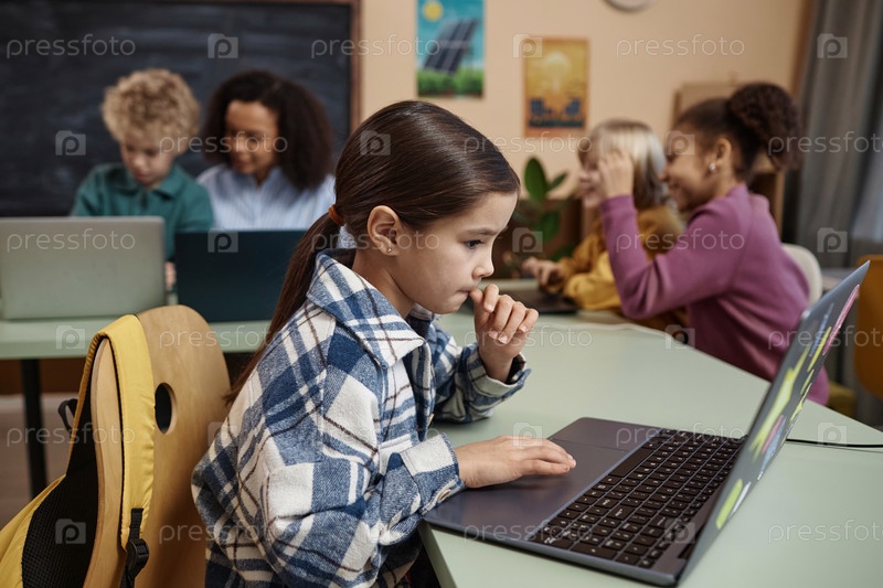 Милая девочка, использующая ноутбук на уроке ИТ