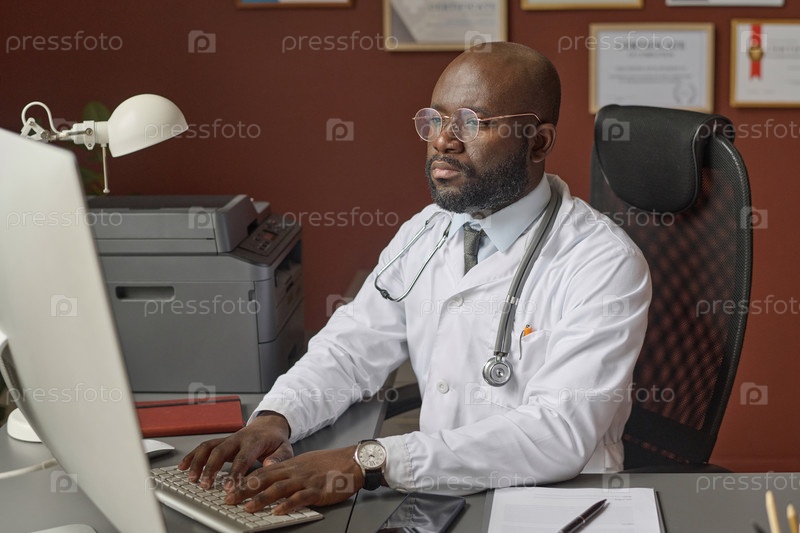 Профессиональный врач внимательно работает на компьютере