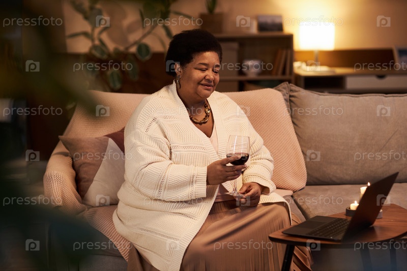 Старшая чернокожая женщина разговаривает по видеочату и наслаждается бокалом вина