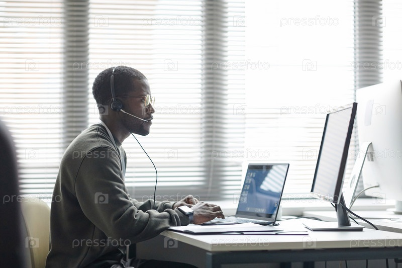 Черный молодой человек, носящий наушники и использующий компьютеры