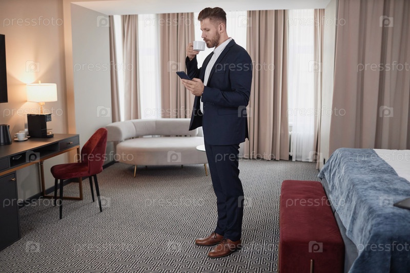 Бизнесмен с чашкой кофе в гостиничном номере