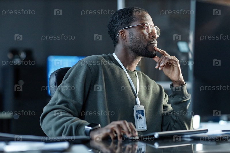 Черный молодой человек, носящий очки и размышляющий