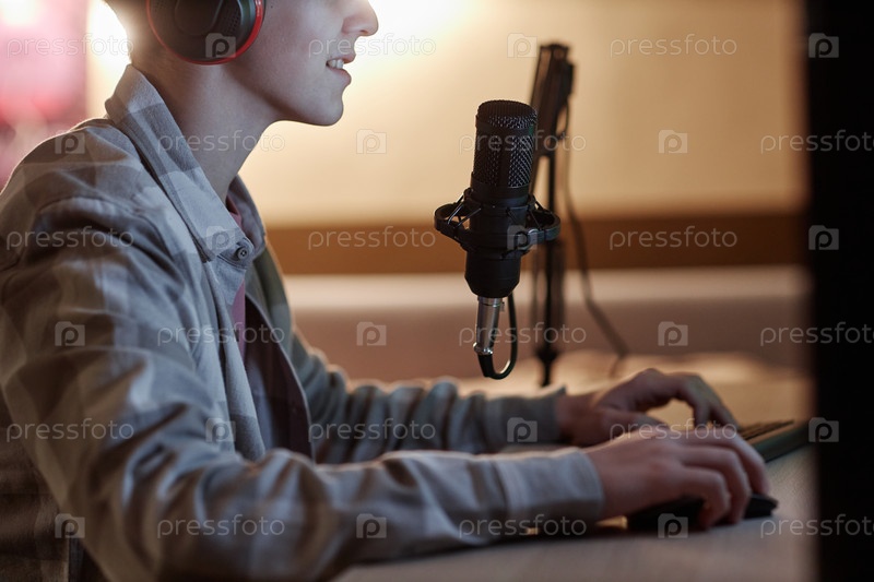 Мальчик-подросток играет в видеоигры и использует микрофон