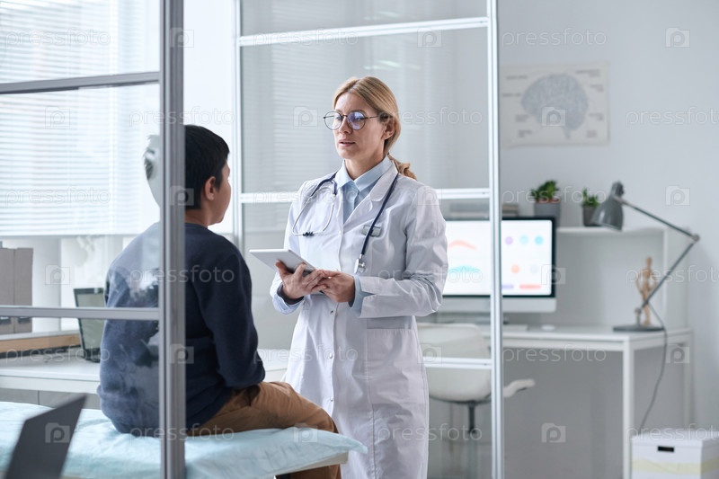 Женщина-врач разговаривает с мальчиком в клинике
