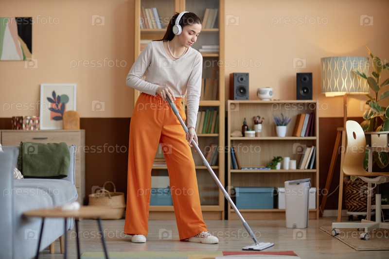 Девушка, которая носит наушники и подметает полы