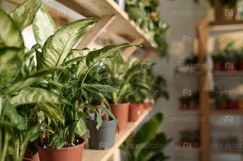 Комнатные растения в горшках на полках в магазине