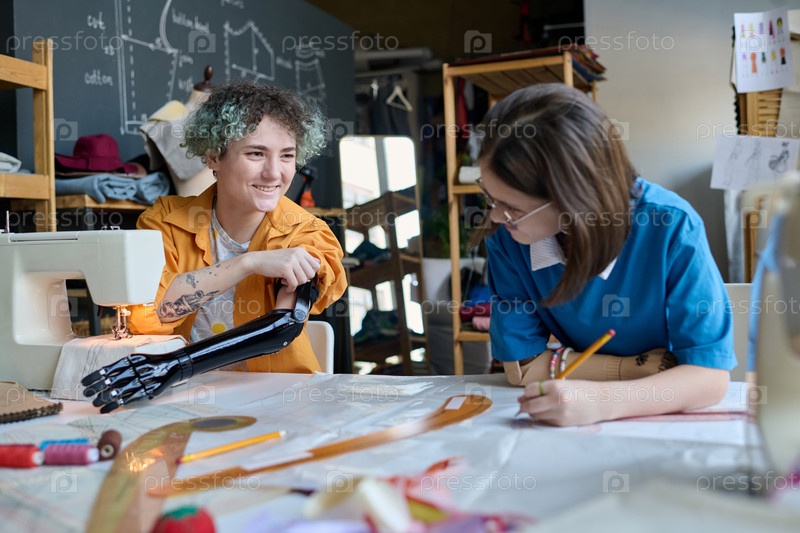 Две улыбающиеся девочки-подростки с протезами шиют одежду