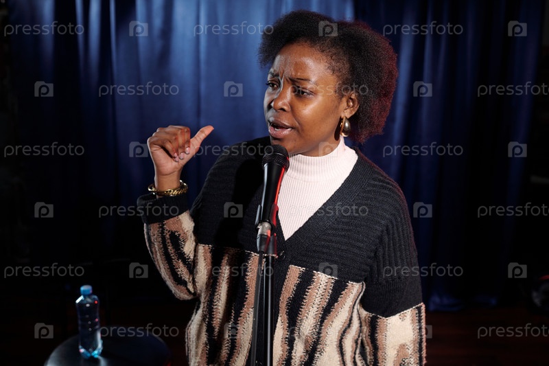Выступая на сцене с синими шторами