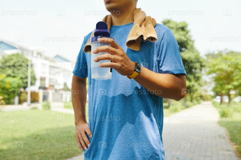 Потный спортсмен, пьющий воду