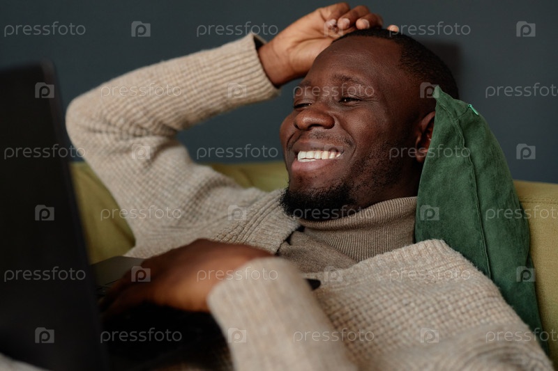Улыбающийся чернокожий лежит на диване и смотрит в ноутбук