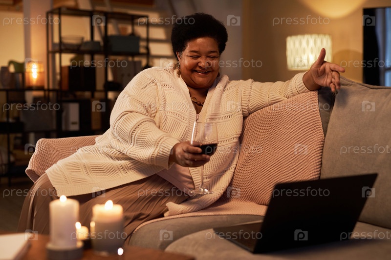 Старшая чернокожая женщина разговаривает через видеочат с вином