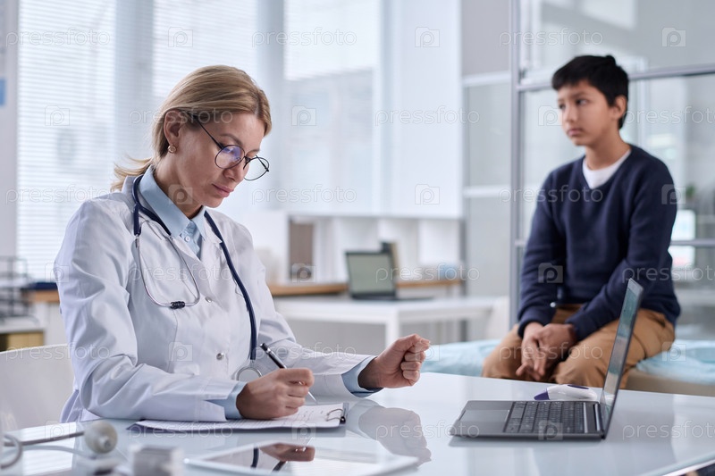 Доктор, делающий заметки с ребенком