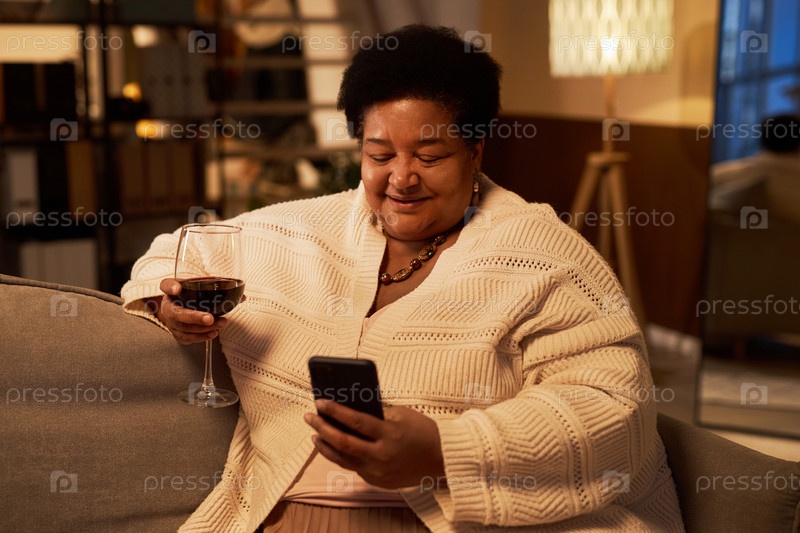 Чёрная пожилая женщина, использующая телефон дома вечером