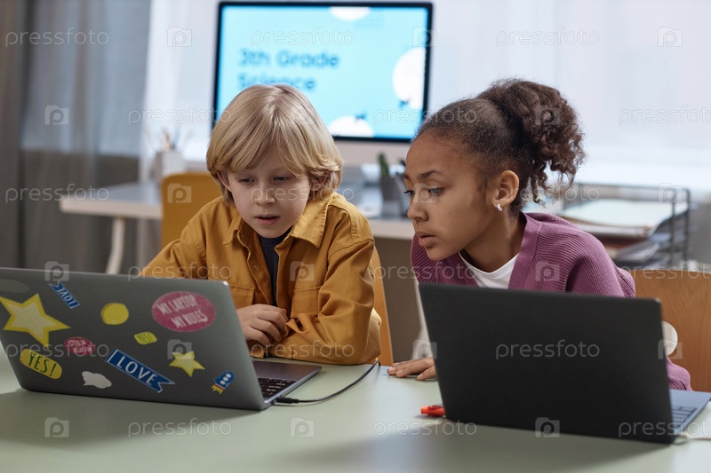 Два ребенка используют ноутбуки в классе