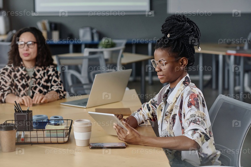 Молодой афроамериканский офисный сотрудник работает на планшете за рабочим столом