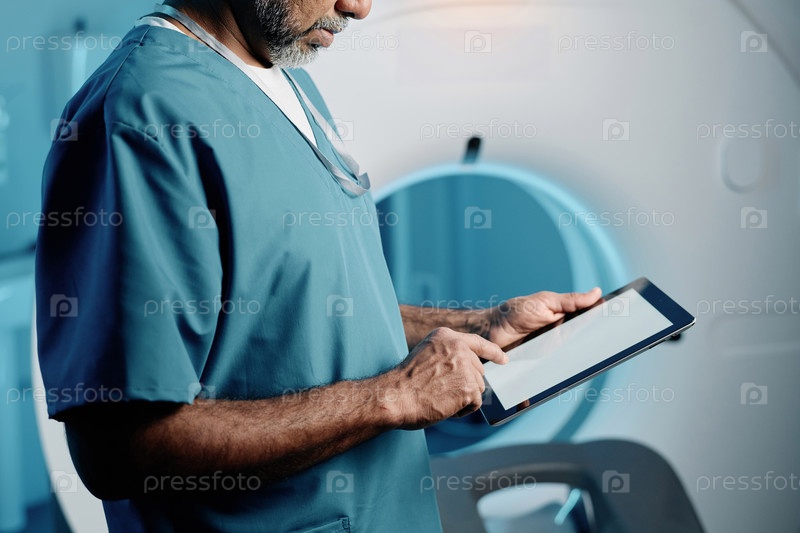 Радиолог устанавливает МРТ-сканер с использованием цифрового планшета