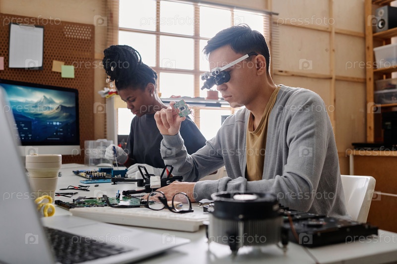 Бирациальные специалисты работают над гаджетами, которые ремонтируются в мастерской