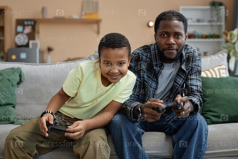 Черный отец и сын играют в видеоигру
