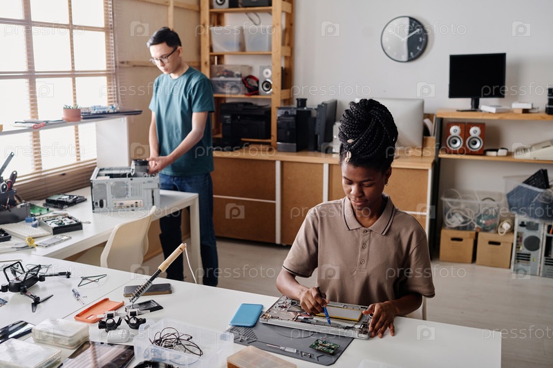 Два молодых бирациальных человека ремонтируют электронику в мастерской