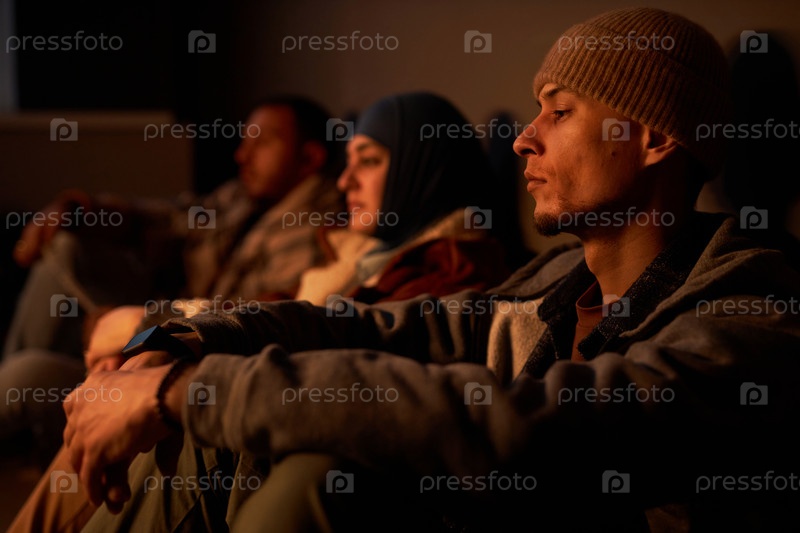 Группа ближневосточных людей, скрывающихся в темном бомбоубежище