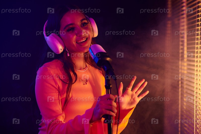 Женщина наслаждается пением в микрофоне