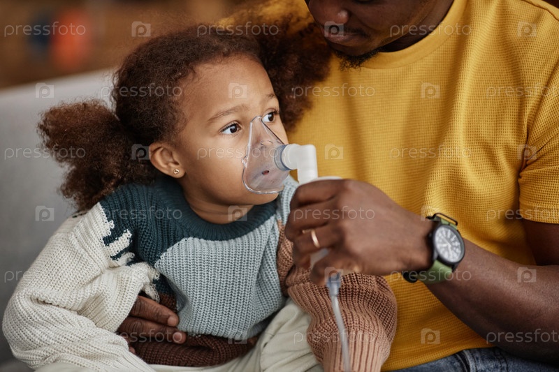 Дошкольная девочка с папой, держащей маску небулайзера Ill