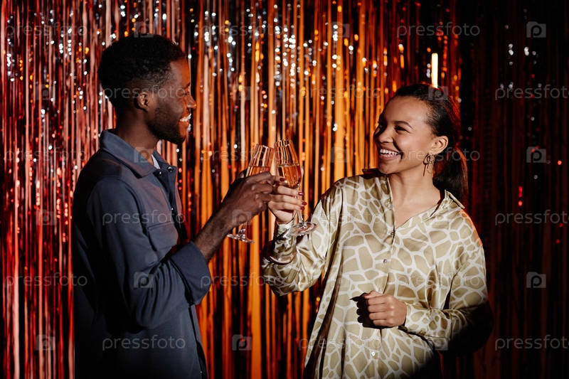 Улыбающийся мужчина и женщина пьют шампанское на вечеринке