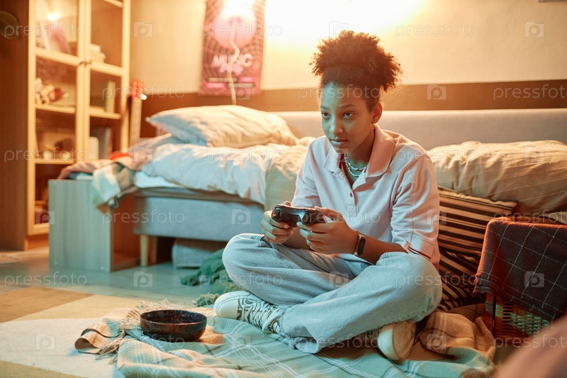 Девочка-подросток играет в видеоигры, сидя на полу