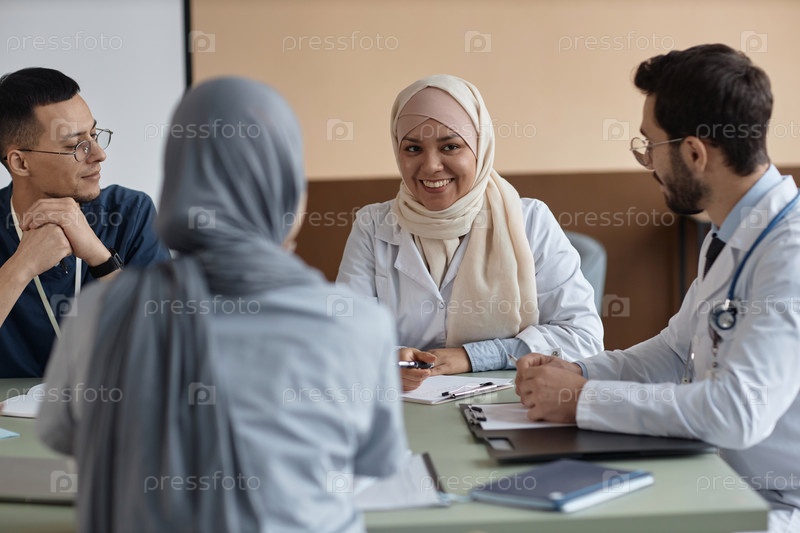 Улыбающаяся женщина-врач в хиджабе за столом с коллегами