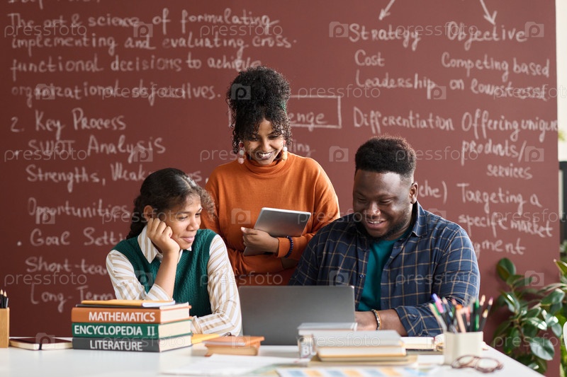 Три чёрных студента колледжа смотрят на ноутбук