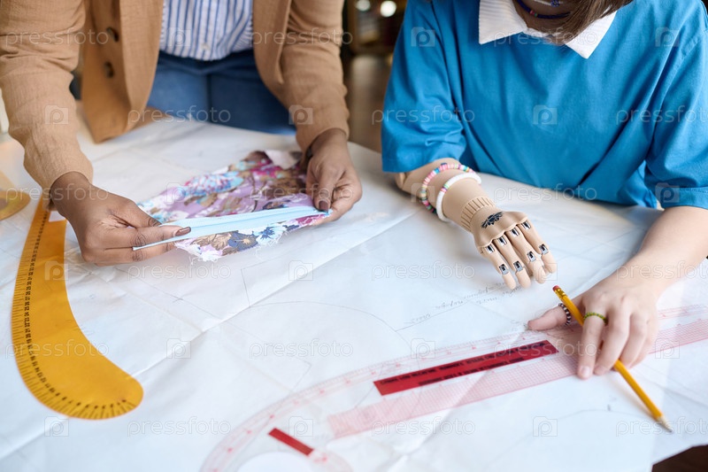 Девушка с протезированной рукой, работающая над образцом одежды