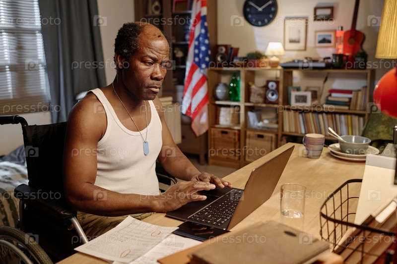 Зрелый чернокожий мужчина просматривает информацию на портативном компьютере дома