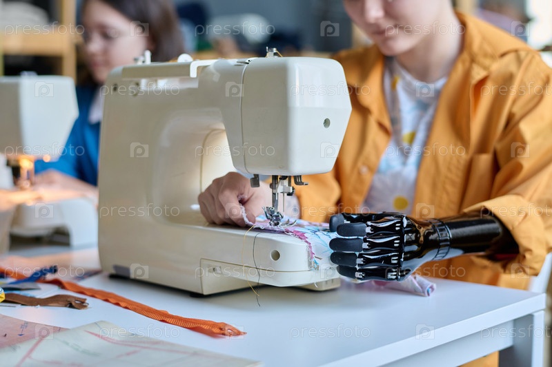 Девушка с протезированной рукой, использующей швейную машину