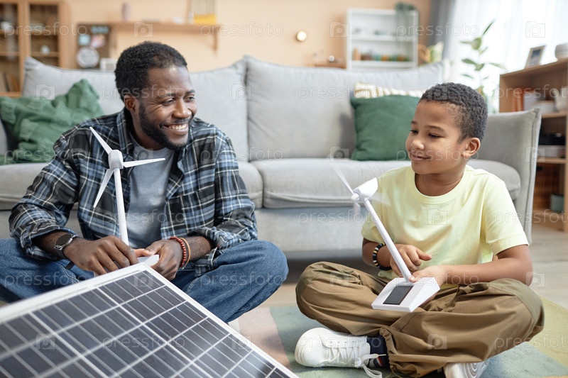 Отец учит ребенка возобновляемой энергии