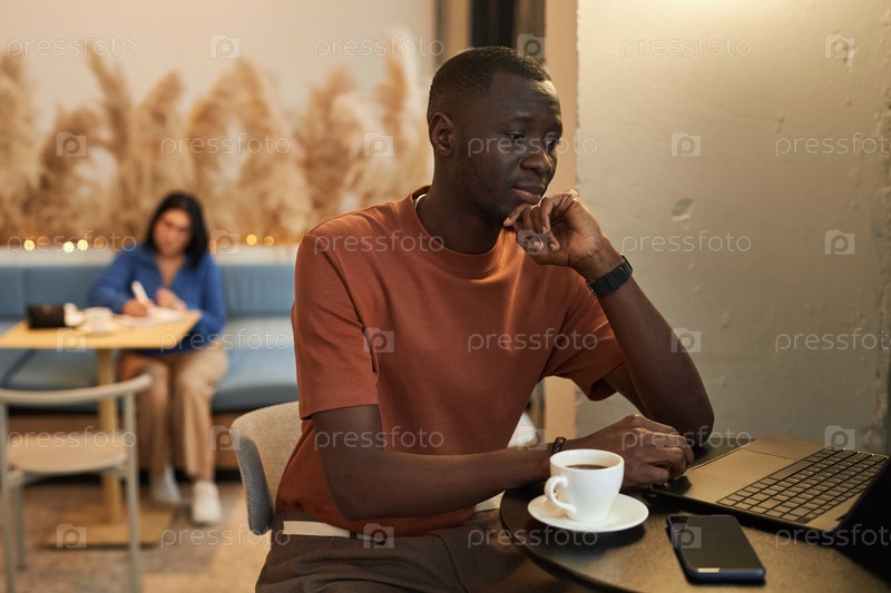 Чернокожий мужчина использует ноутбук в кофейне и смотрит на экран