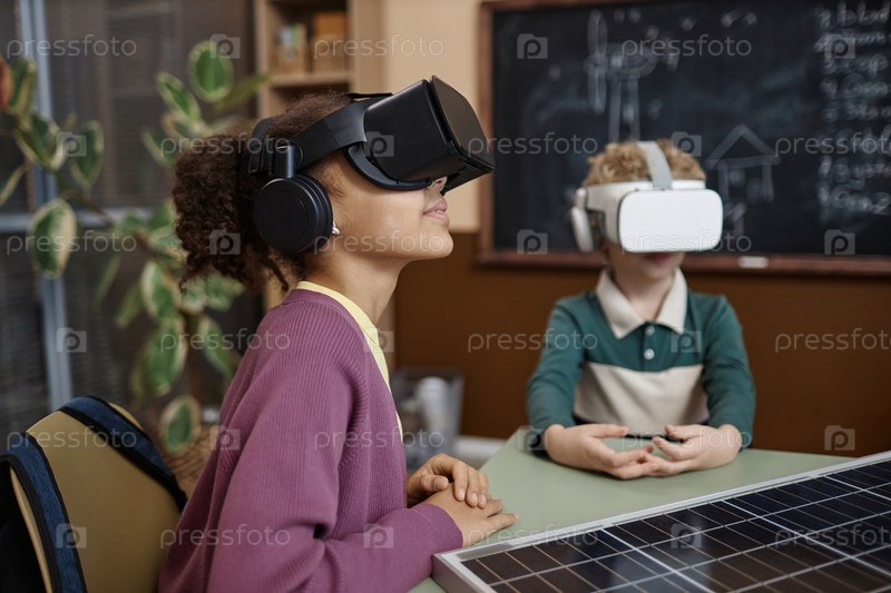 Черная девушка, носящая VR-гарнитуру в школьном классе