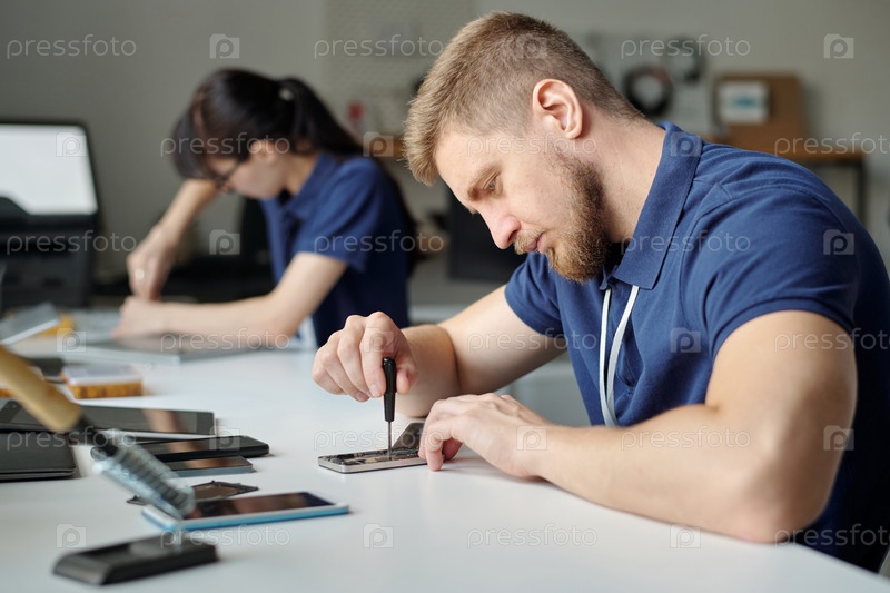 Человек, исправляющий крошечные детали смартфона