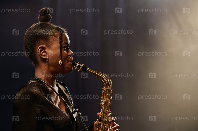 Черная женщина играет на саксофоне