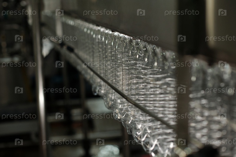 Пустые бутылки передвигаются вдоль ленточного конвейера