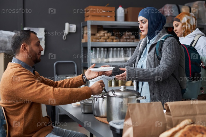 Женщина с Ближнего Востока получает еду в центре помощи беженцам