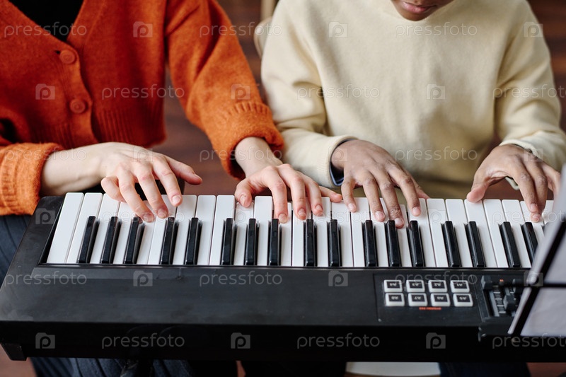 Непризнанная женщина и мальчик играют на синтезаторе