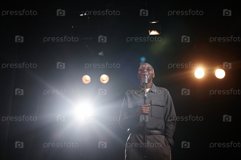 Человек, говорящий в микрофон стоя на сцене