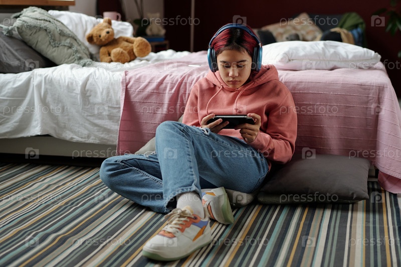 Девушка смотрит на экран телефона в геймпаде