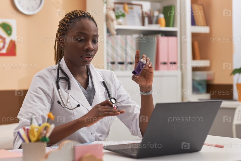 Врач демонстрирует ингалятор во время онлайн-консультации
