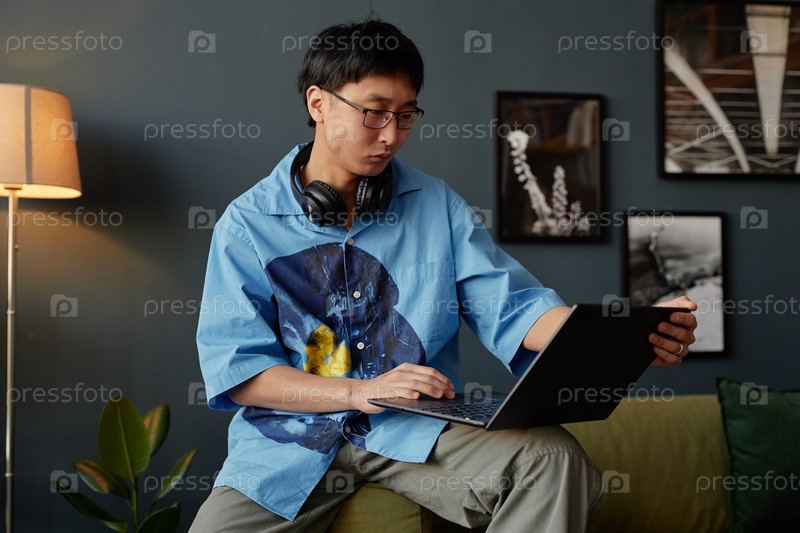 Азиатский мужчина использует ноутбук в офисной гостиной