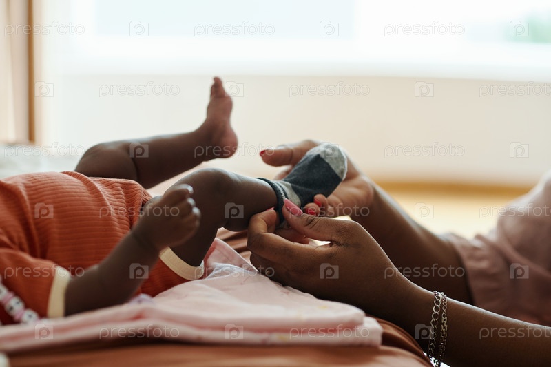 Мать кладет носки на ноги ребенку