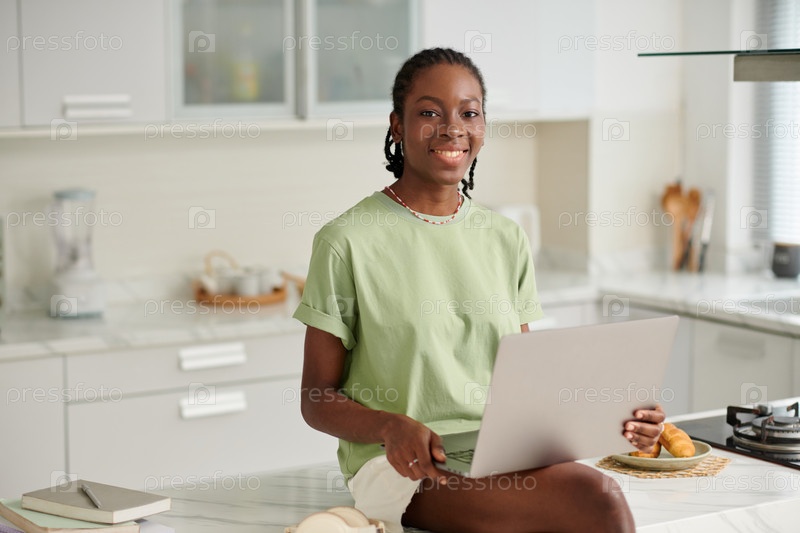 Веселая черная девушка с ноутбуком