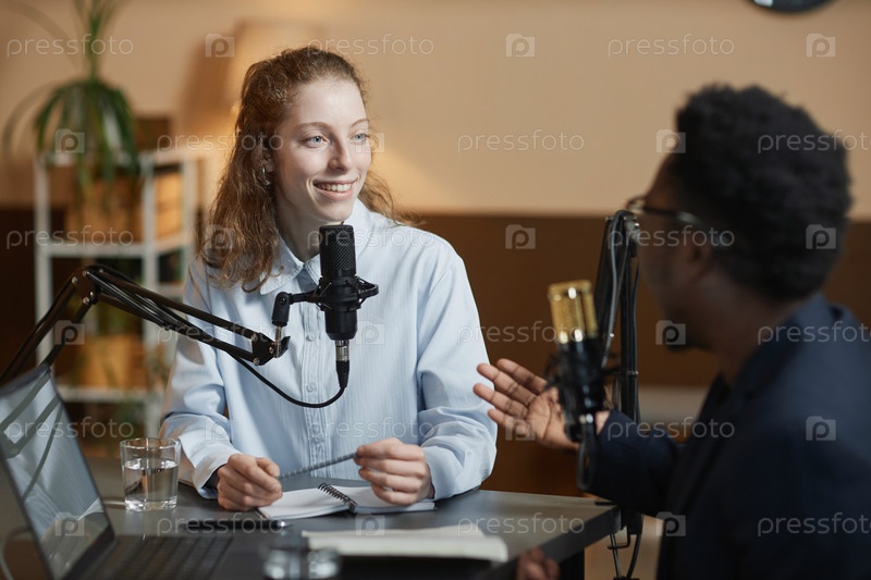 Улыбающаяся женщина слушает гостя подкаста