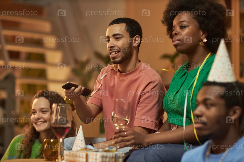 Разнообразная группа взрослых, смотрящих телевизор