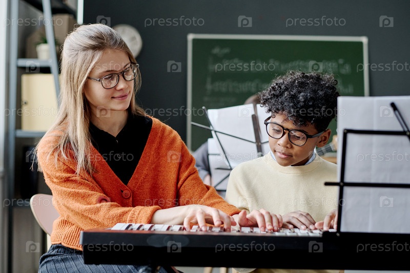 Молодая женщина преподает музыку в школе